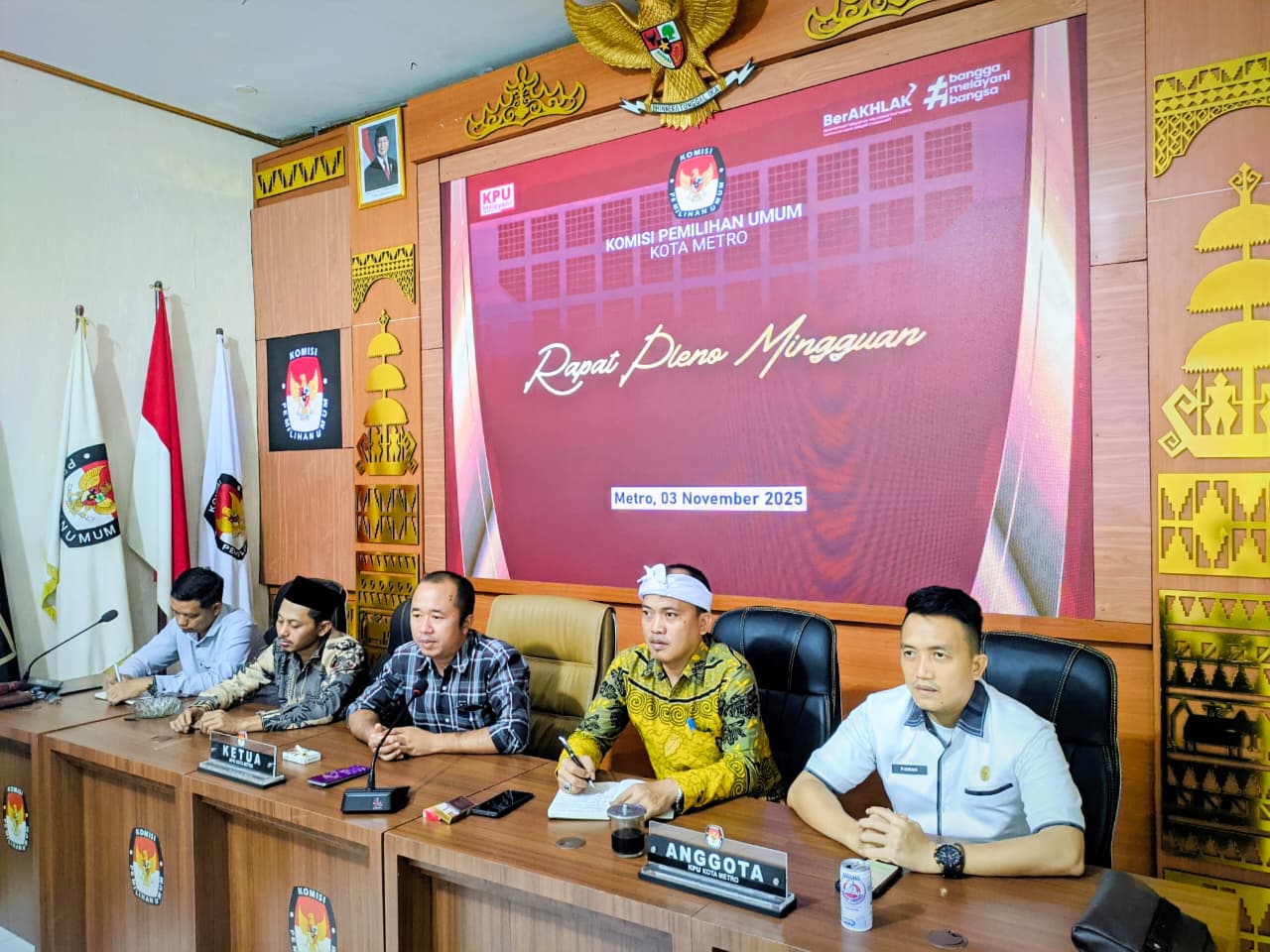 Metro, Senin, 3 November 2025 — Komisi Pemilihan Umum (KPU) Kota Metro melaksanakan Rapat Pleno Mingguan yang dihadiri oleh seluruh Komisioner, Sekretaris, serta para Kepala Subbagian. Rapat yang berlangsung di ruang rapat utama ini dipimpin langsung oleh Ketua KPU Kota Metro, Erzal Syahreza Aswir.