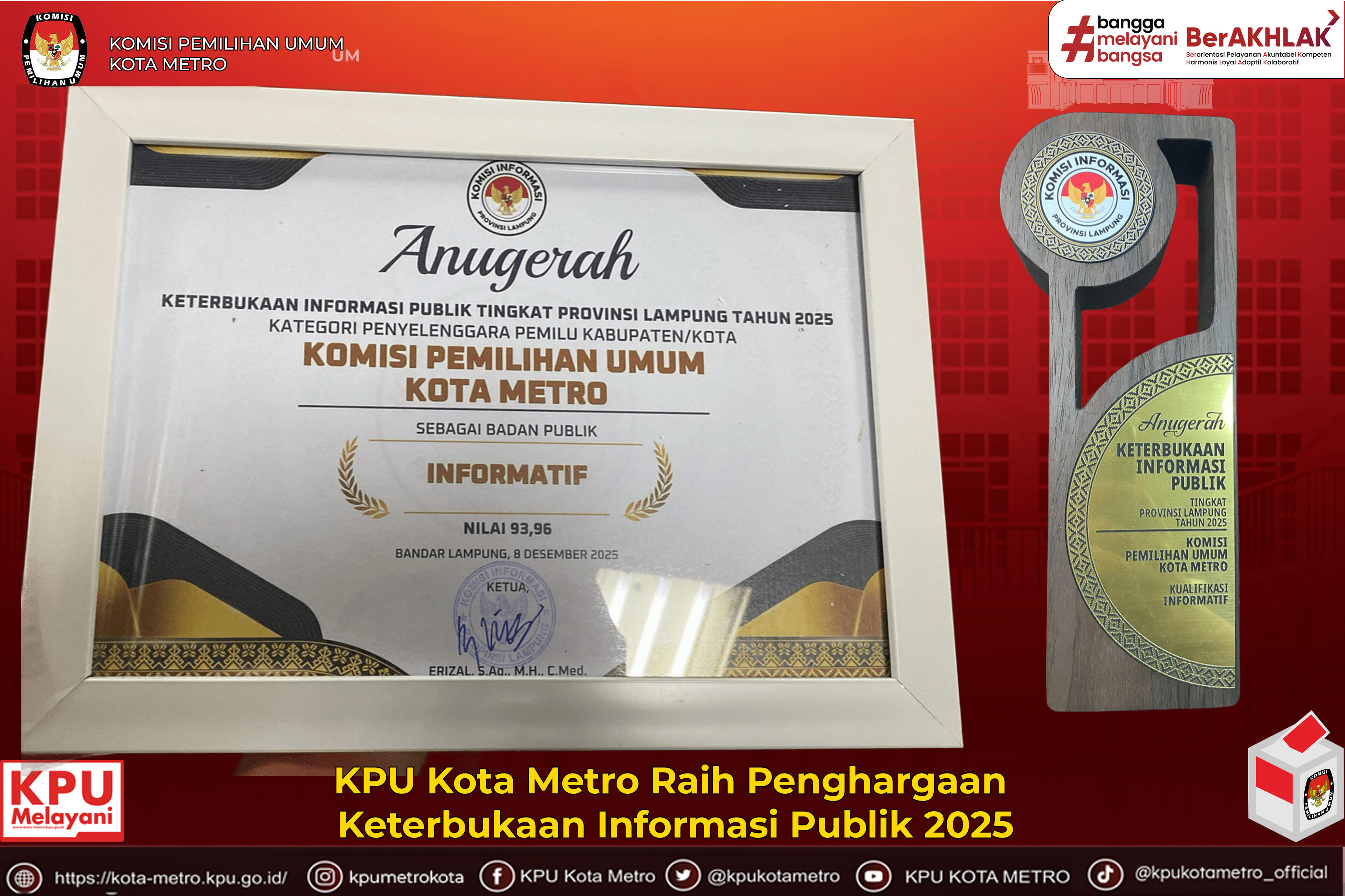 #temanpemilih, Bandar Lampung, 8 Desember 2025 – KPU Kota Metro berhasil meraih Penghargaan Keterbukaan Informasi Publik Tingkat Provinsi Lampung Tahun 2025 dengan kategori Penyelenggara Pemilu Tingkat Kabupaten/Kota sebagai Badan Publik Informatif, memperoleh nilai 93,96.