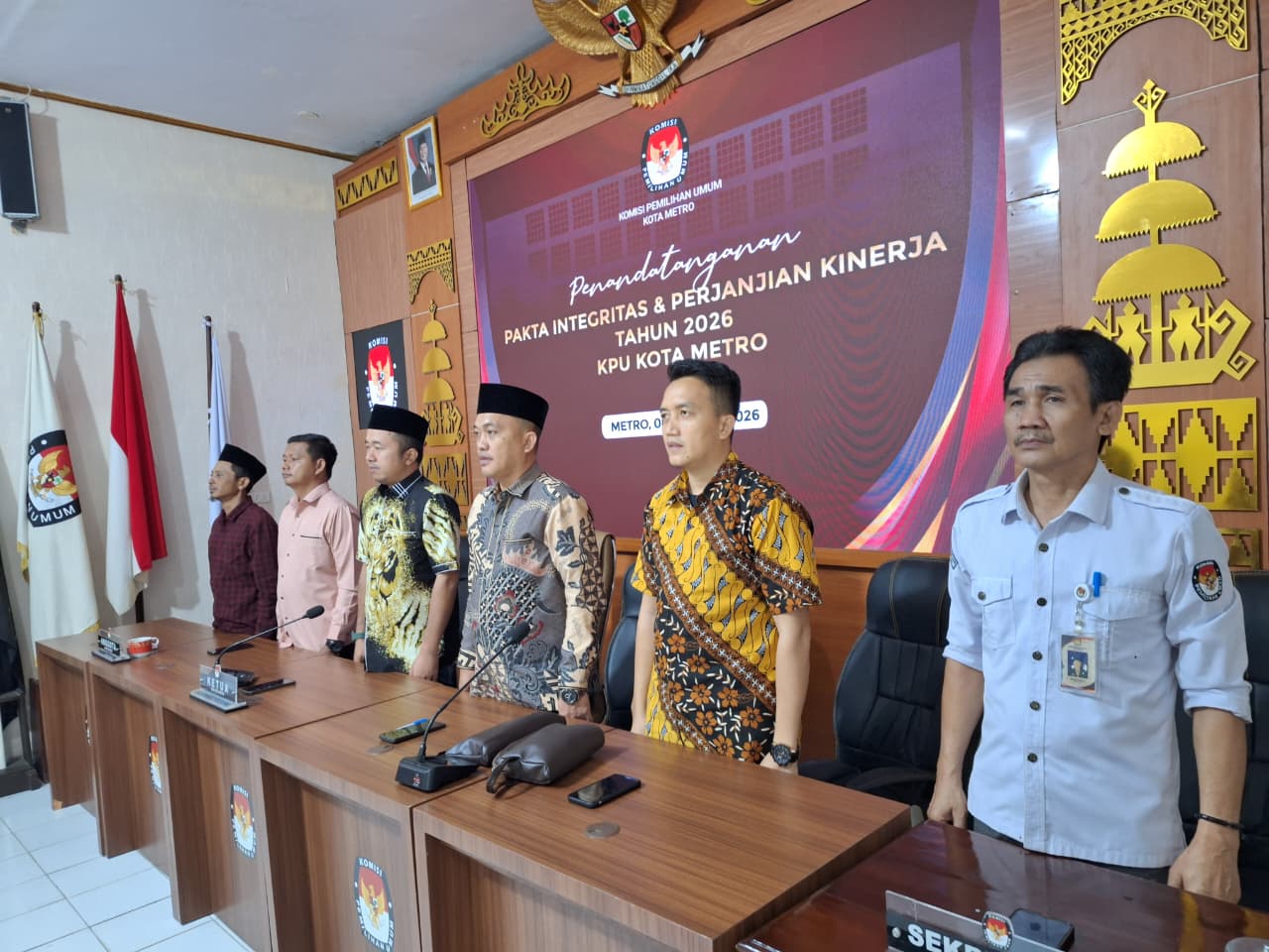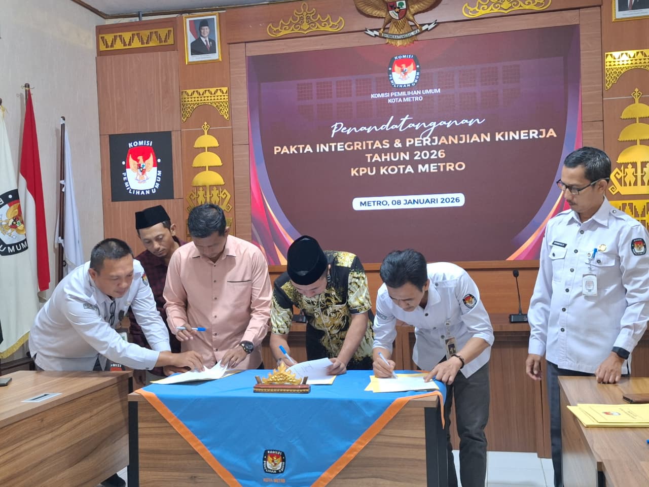 #temanpemilih, KPU Kota Metro pada hari Kamis, 8 Januari 2025, melaksanakan kegiatan Penandatanganan Pakta Integritas dan Perjanjian Kinerja Tahun 2026 yang bertempat di Aula KPU Kota Metro. Kegiatan ini dihadiri oleh Ketua KPU Kota Metro Erzal Syahreza Aswir, Anggota KPU Kota Metro (Erwin Agus Fadli, Rinaldi Adiyatama, Firman Arafat, Anton Galuh Susanto), Sekretaris Jumadi Ahmad, serta para Kasubbag dan staf Sekretariat KPU Kota Metro.