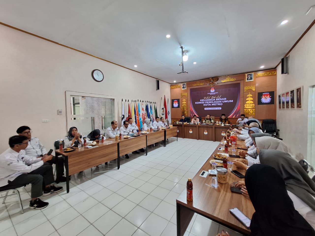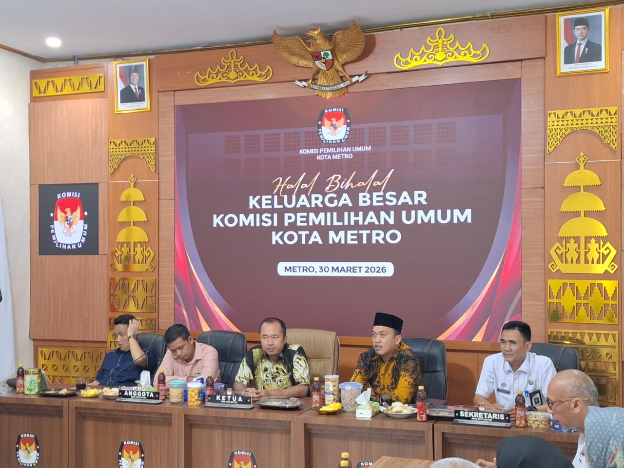 #temanpemilih, Senin, 30 Maret 2026, KPU Kota Metro melaksanakan kegiatan Halal Bihalal Idul Fitri 1447 H / 2026 M di Aula KPU Kota Metro. Acara ini dihadiri oleh Ketua KPU Kota Metro, Erzal Syahreza Aswir, Anggota KPU Kota Metro (Erwin Agus Fadli, Firman Arafat, Rinaldi Adiyatama), Sekretaris Jumadi Ahmad, para Kasubbag, serta seluruh staf pelaksana sekretariat.