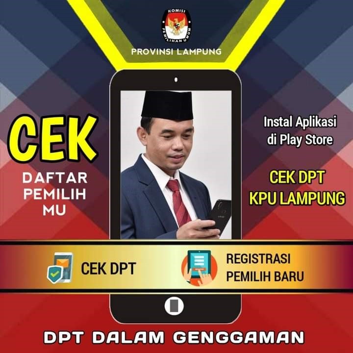 Untuk Warga Lampung jangan kuatir tidak terdaftar dalam DPT, Cek DPT dalam genggaman, tinggal install dui HP Android anda dari Playstore dan untuk Pemilih baru bisa registrasi, manfaatkanlah kemudahan ini, ingat... Suara anda menentukan Masa Depan Bangsa