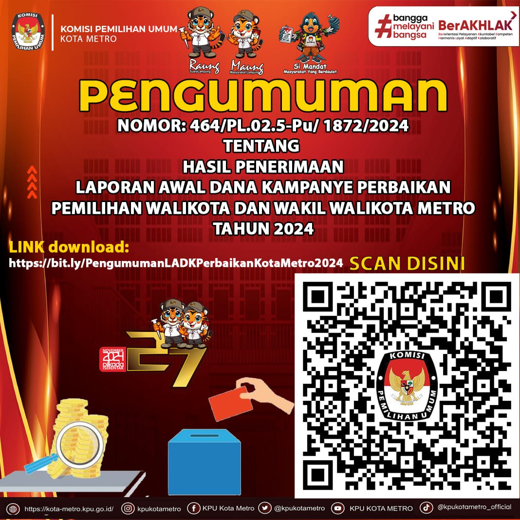 #temanpemilih, berikut disampaikan Pengumuman Nomor: 464/Pl.02.5-Pu/ 1872/2024 Tentang Hasil Penerimaan Laporan Awal Dana Kampanye PERBAIKAN Pemilihan Walikota Dan Wakil Walikota Metro Tahun 2024, silahkan download di link: https://bit.ly/PengumumanLADKPerbaikanKotaMetro2024