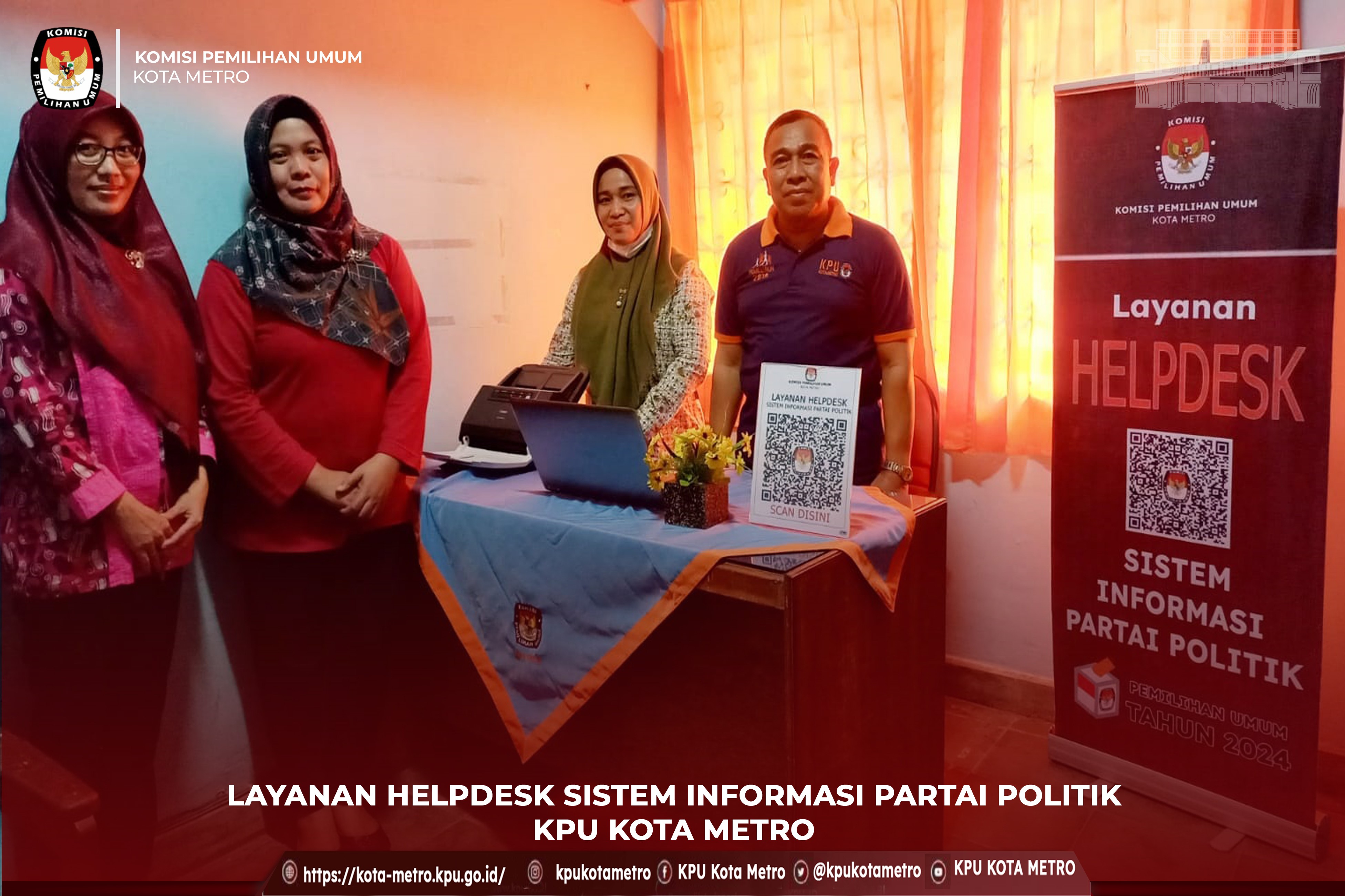 , Saat ini tahapan Pemilihan Umum tahun 2024 adalah Tahapan Pendaftaran, Verifikasi dan Penetapan Partai Politik Peserta Pemilu tahun 2024 yang waktunya hingga 14 Desember 2024, untuk itu KPU Kota Metro membuka Layanan Helpdesk Sistem Informasi Partai Politik bagi Partai Politik yang ada di Kota Metro. Waktu pelayanan setiap hari kerja dan hari Sabtu dan Minggu tetap melayani seperti jam kerja.