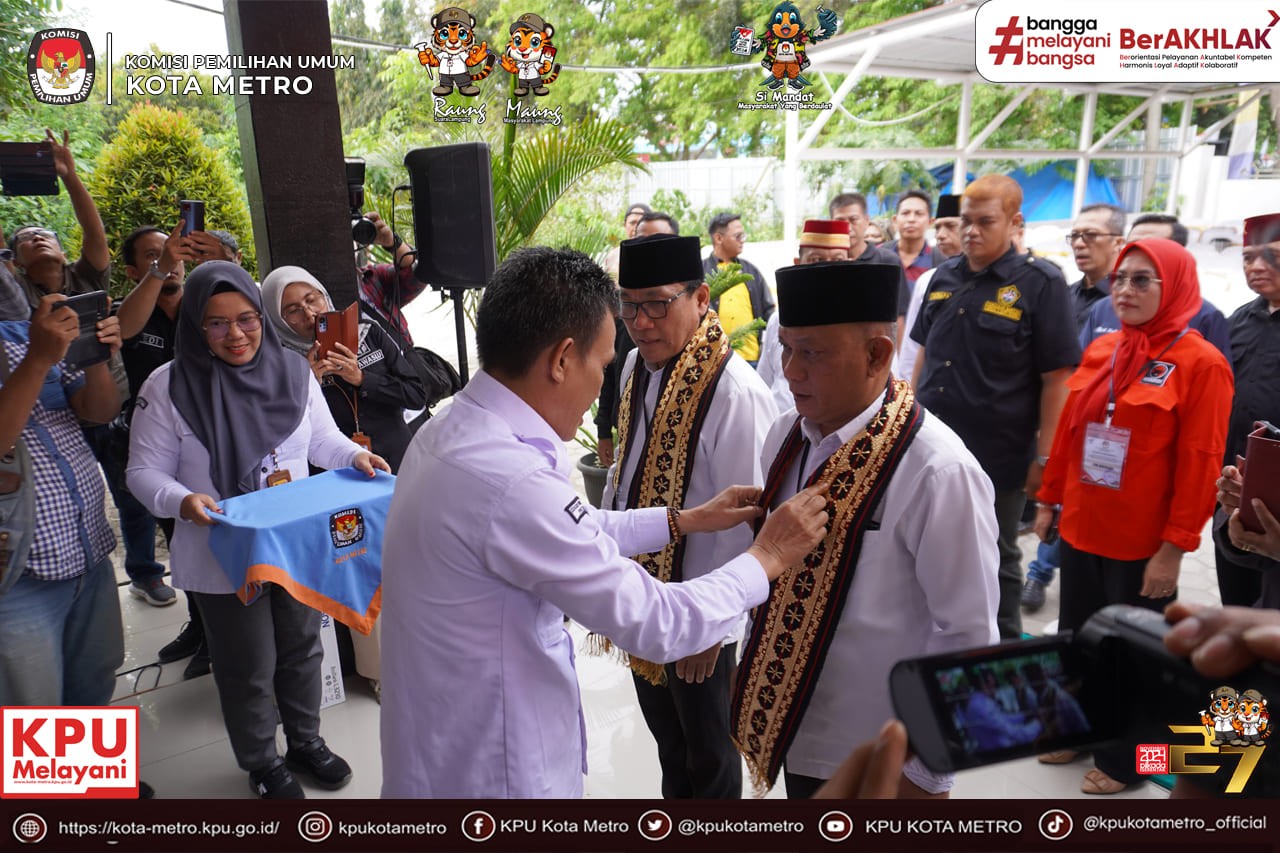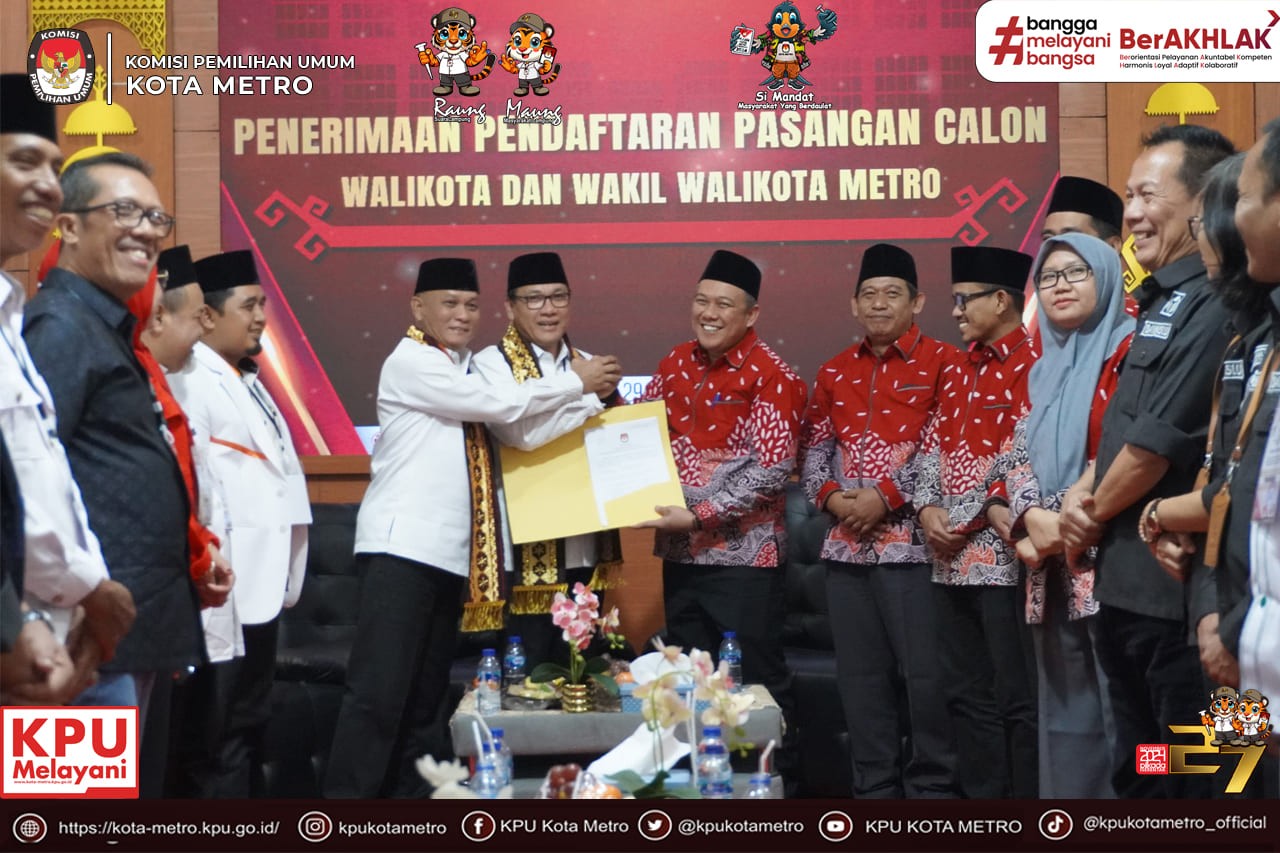 Pendaftaran dari Bakal Pasangan Calon Walikota dan Wakil Walikota Metro yaitu Bapak dr. Wahdi, Sp.OG (K), M.H. dan Bapak Drs. Hi. Qomaru Zaman, M.A.