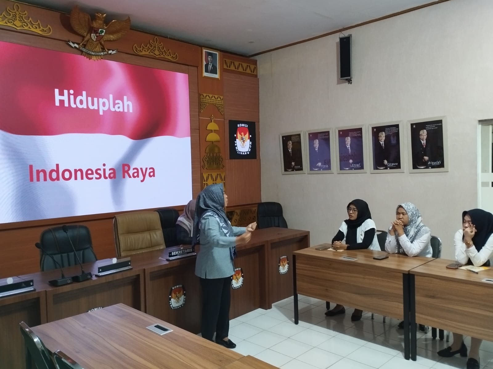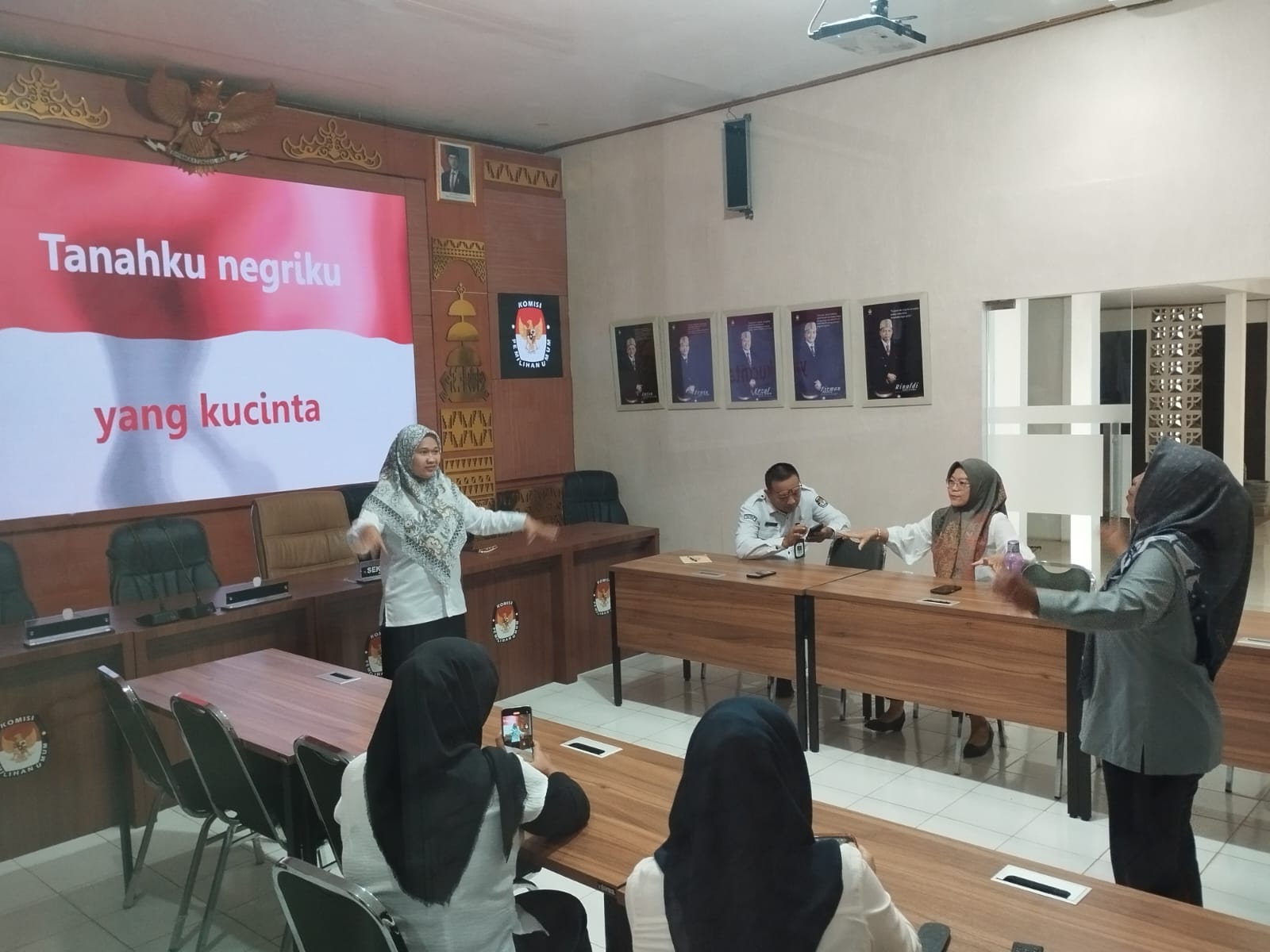 Kasubbag KUL Zilvia Evirilianty mendampingi staf dalam rangka melaksanakan kegiatan Penguatan kapasitas kelembagaan, dalam pelatihan dirigen kepada staf pelaksana KPU Kota Metro di Aula Kantor KPU Kota Metro