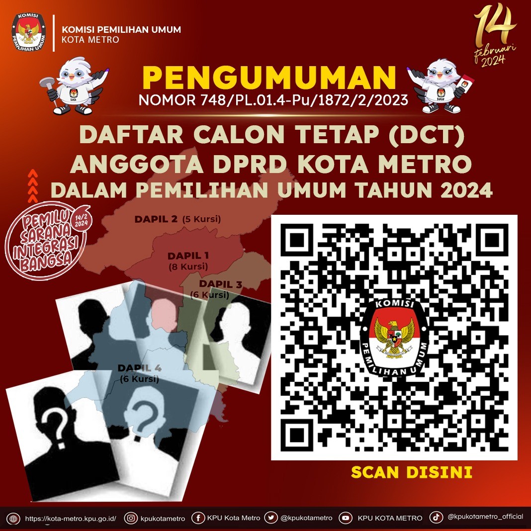 Berikut disampaikan Pengumuman Daftar Calon Tetap (DCT) Anggota DPRD Kota Metro Dalam Pemilihan Umum Tahun 2024, dapat diunduh dengan menscan Barcode di info grafis, atau melalui link:
