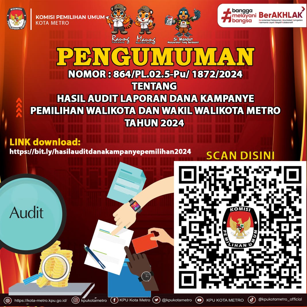 Pengumuman NOMOR: 864/PL.02.5-Pu/1872/2024 Tentang Hasil Audit Laporan Dana Kampanye Pemilihan Walikota Dan Wakil Walikota Metro Tahun 2024