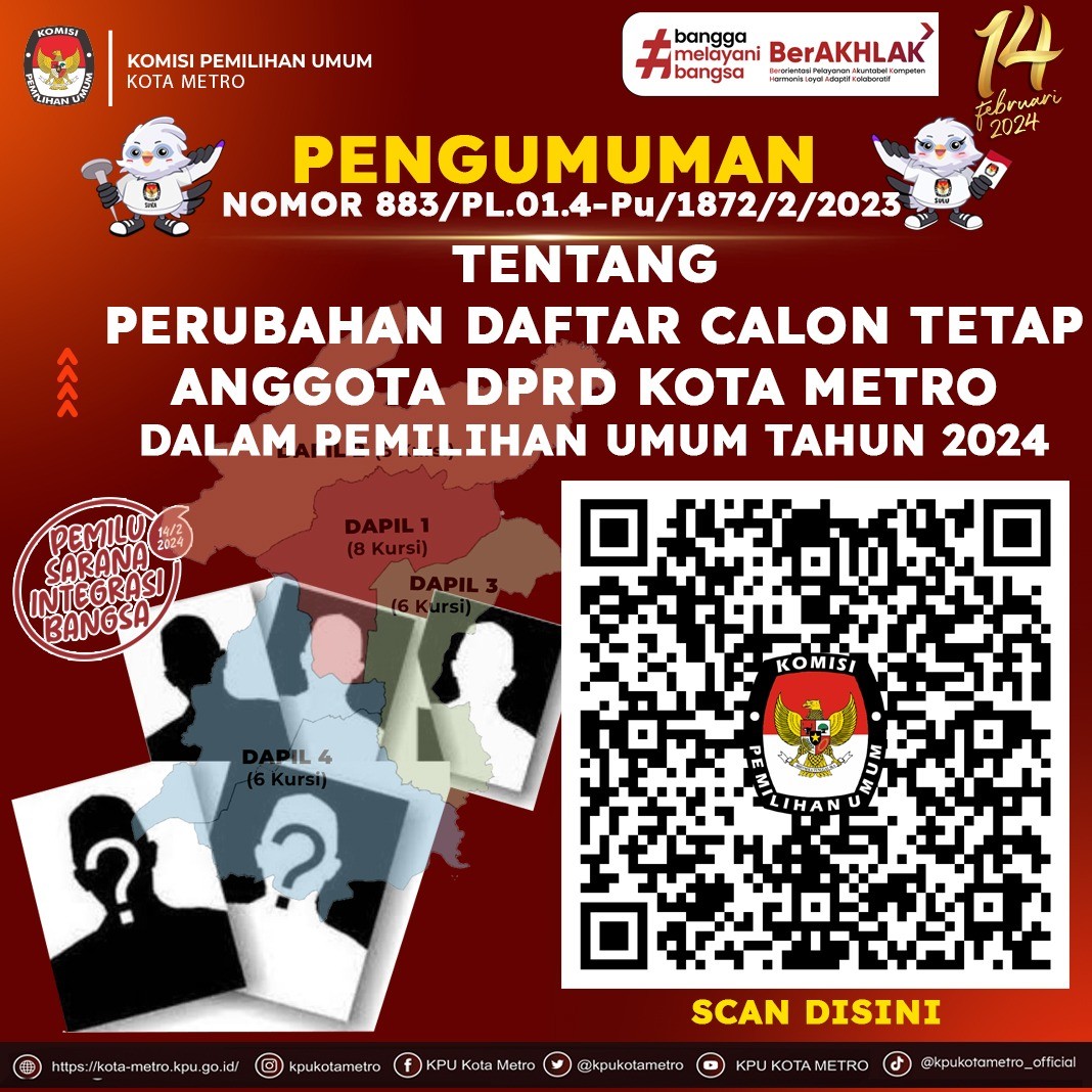 Berikut disampaikan Pengumuman PERUBAHAN Daftar Calon Tetap (DCT) Anggota DPRD Kota Metro Dalam Pemilihan Umum Tahun 2024, dapat diunduh dengan menscan Barcode di info grafis, atau melalui link: