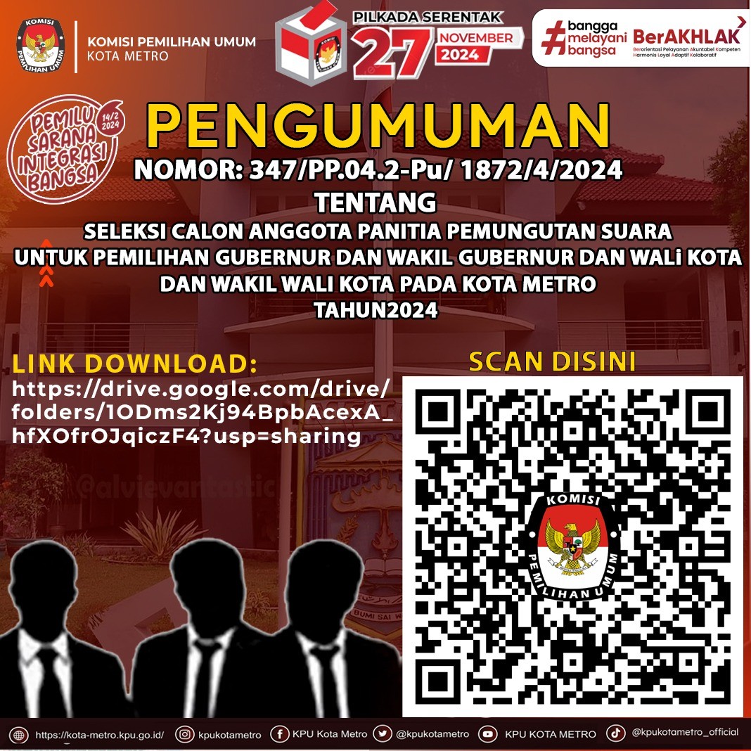 PENGUMUMAN NOMOR : 347/PP.04.2-Pu/ 1872/4/2024 Tentang Seleksi Calon Anggota Panitia Pemungutan Suara Untuk Pemilihan Gubernur Dan Wakil Gubernur Dan Wali Kota Dan Wakil Wali Kota Pada Kota Metro Tahun 2024