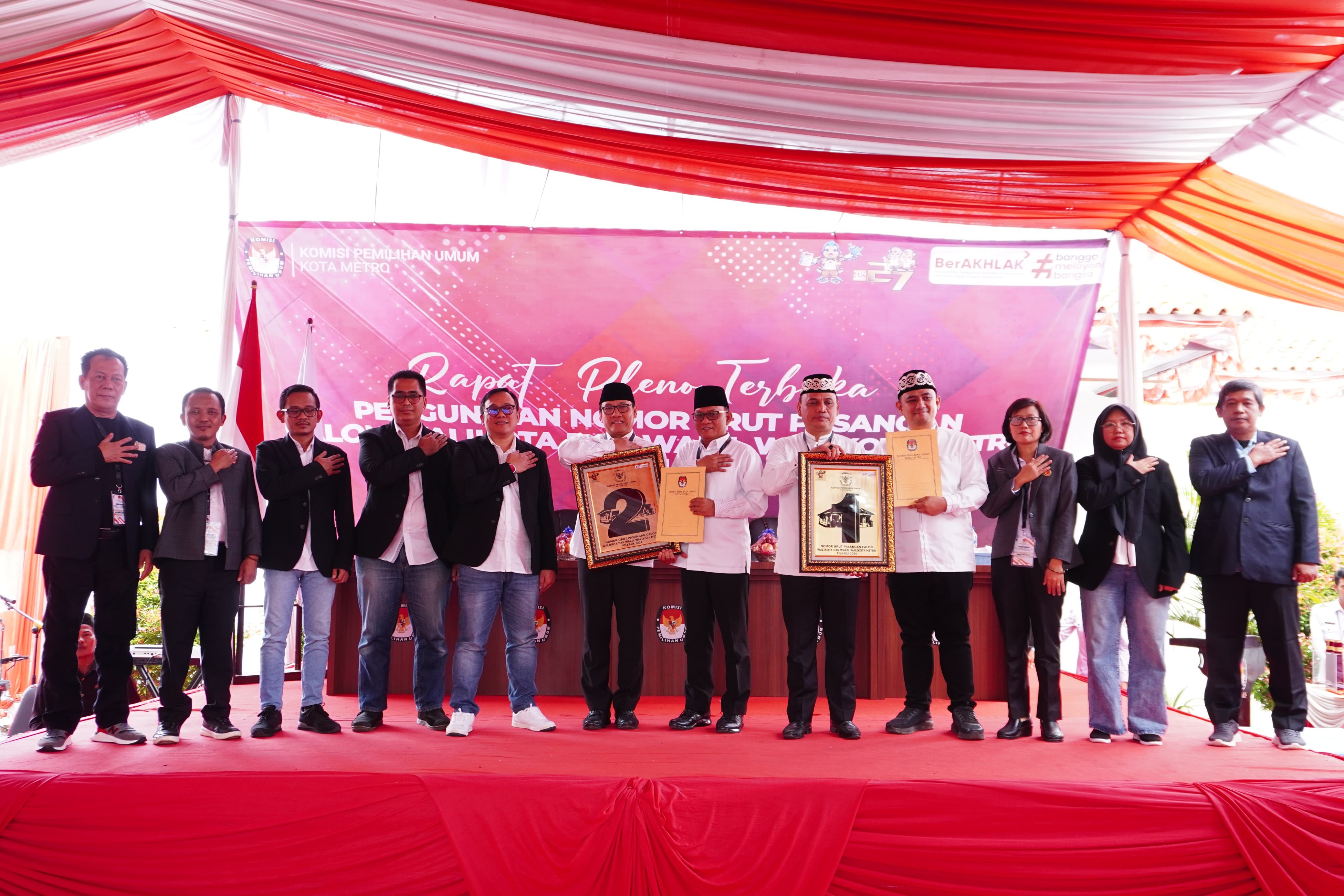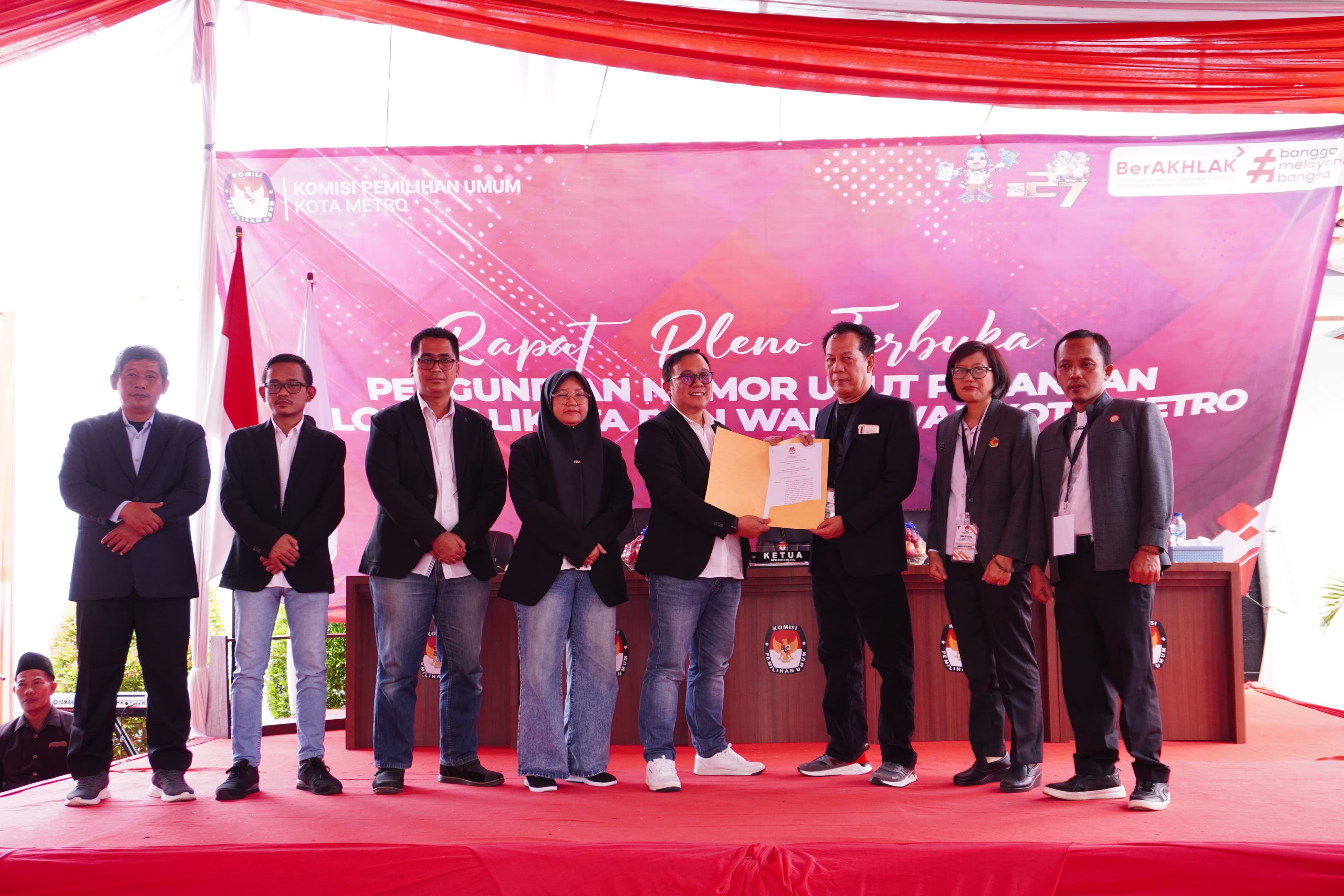 Rapat dipimpin langsung oleh Ketua KPU Kota Metro Nurris Septa Pratama dan Anggota KPU Kota Metro.hasil rapat tertuang pada Keputusan KPU Kota Metro Nomor 301 Tahun 2024 Tentang Penetapan Nomor Urut Pasangan Calon Peserta Pemilihan Walikota Dan Wakil Walikota Metro Tahun 2024 Tanggal 23 September 2024 dengan menetapkan Pasangan Calon Walikota dan Wakil Walikota Metro