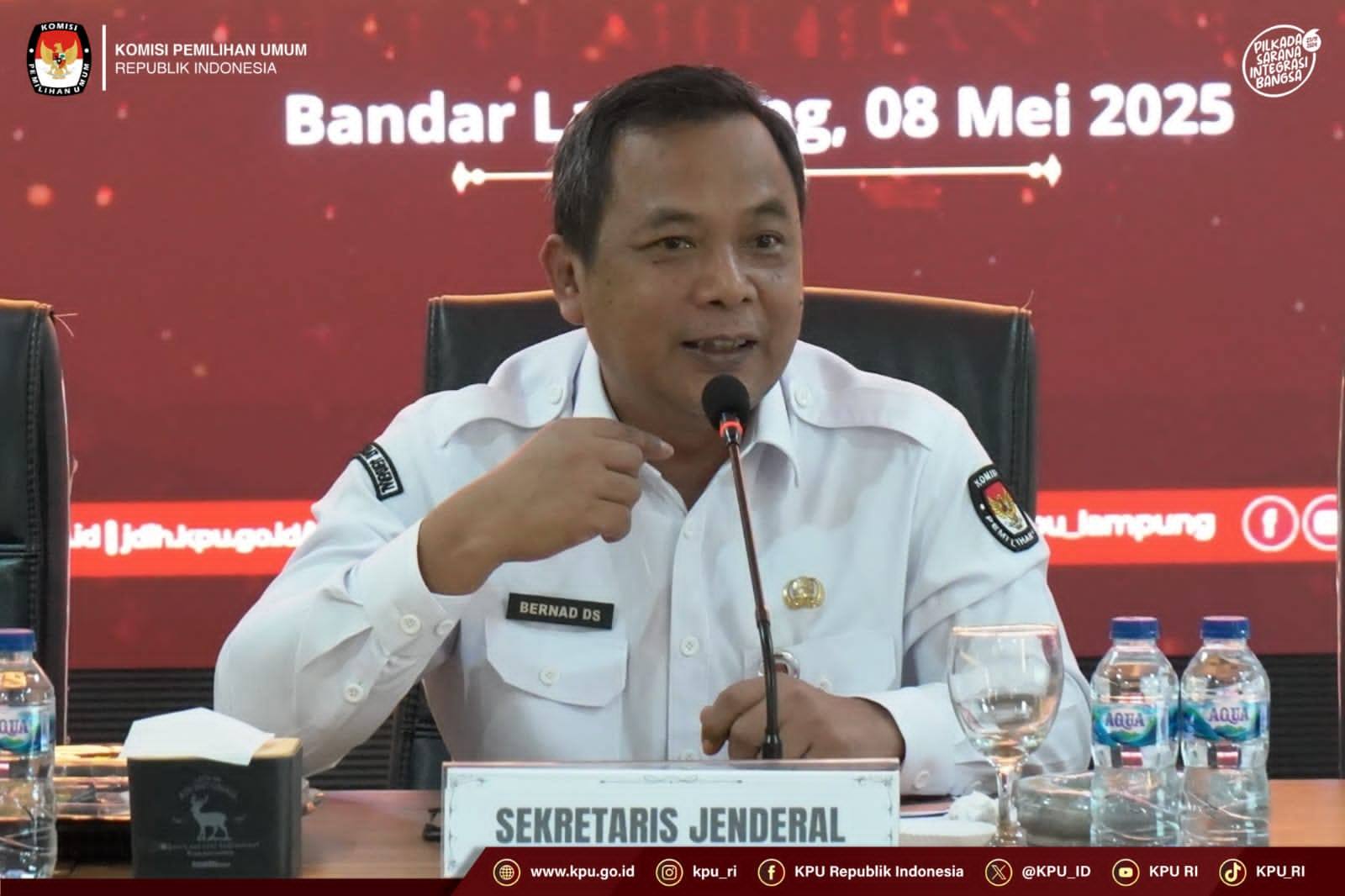 Pesan ini disampaikan oleh Sekretaris Jenderal KPU, Bernad Dermawan Sutrisno dalam pengarahannya kepada jajaran Sekretariat KPU Provinsi dan KPU Kabupaten/Kota Se-Provinsi Lampung di Kantor KPU Provinsi Lampung, Kamis (8/5/2025).