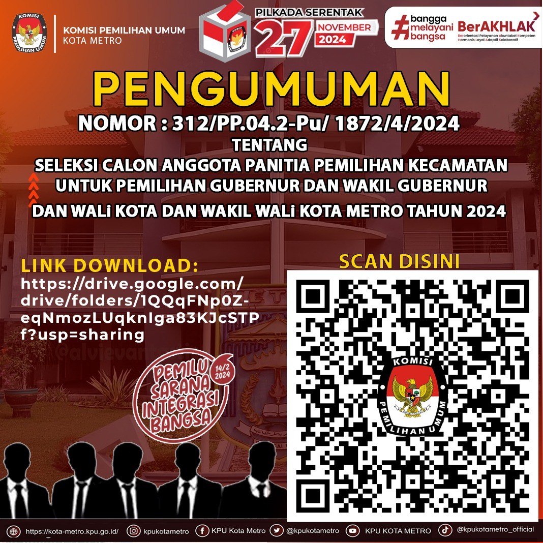 PENGUMUMAN NOMOR : 312/PP.04.2-Pu/ 1872/4/2024 Tentang Seleksi Calon Anggota Panitia Pemilihan Kecamatan Untuk Pemilihan Gubernur Dan Wakil Gubernur Dan Wali Kota Dan Wakil Wali Kota Metro Tahun 2024