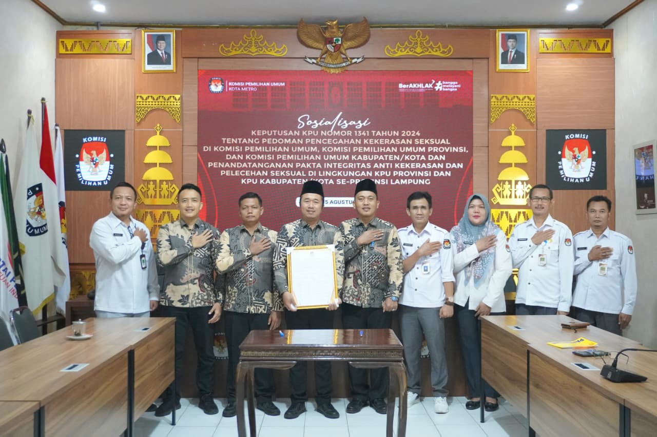 KPU Kota Metro mengikuti Sosialisasi Keputusan KPU Nomor 1341 Tahun 2024 tentang Pedoman Pencegahan Kekerasan Seksual di KPU, KPU Provinsi dan KPU Kabupaten/Kota serta Penandatanganan Pakta Integritas Anti Kekerasan dan Pelecehan Seksual di lingkungan KPU Provinsi dan KPU Kabupaten/Kota se-Provinsi Lampung via daring, Kamis (14/8/2025) pagi.