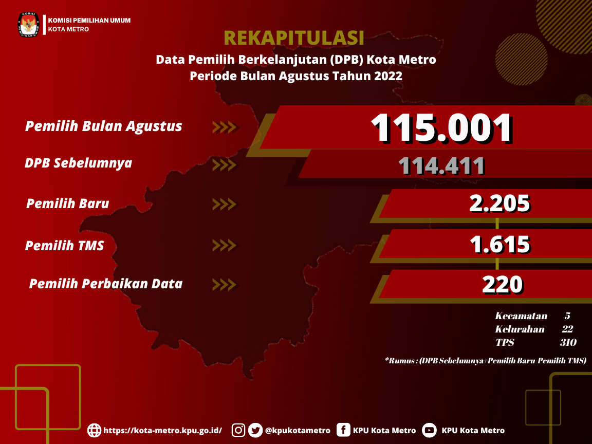 Rapat dihadiri oleh Ketua KPU Nurris Septa Pratama dan Anggota (Ahmad Fatoni, Nova Hadiyanto, Tony Wijaya dan Yunita Dewi Nurbaya), Sekretaris KPU Kota Metro Jumadi Ahmad, Kasubbag Rendatin Bambang Setyawan, Kasubbag Teknis Pemilu dan Hupmas Ismono, Kasubbag Hukum dan SDM Dedi Suwarsono,Kasubbag KUL Zilvia Evirilianty dan Admin Sidalih Desi Kusumawati. Adapun hasil hasil rapat tersebut meliputi : DPB sebelumnya 114.411, pemilih baru 2.205, pemilih TMS 1.615, pemilih perbaikan data 220 sehingga Hasil Rekapitulasi DPB bulan Agustus 2022 sejumlah 115.001.