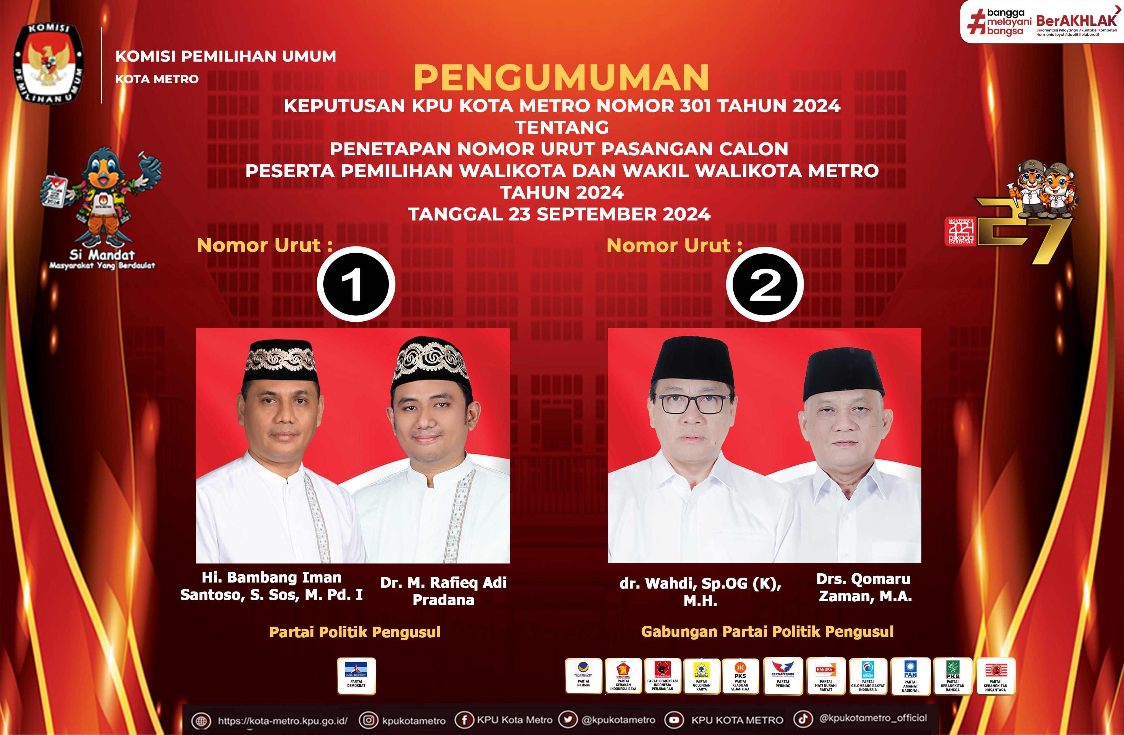 PENGUMUMAN PENETAPAN NOMOR URUT PASANGAN CALON PESERTA PEMILIHAN WALIKOTA DAN WAKIL WALIKOTA METRO TAHUN 2024
