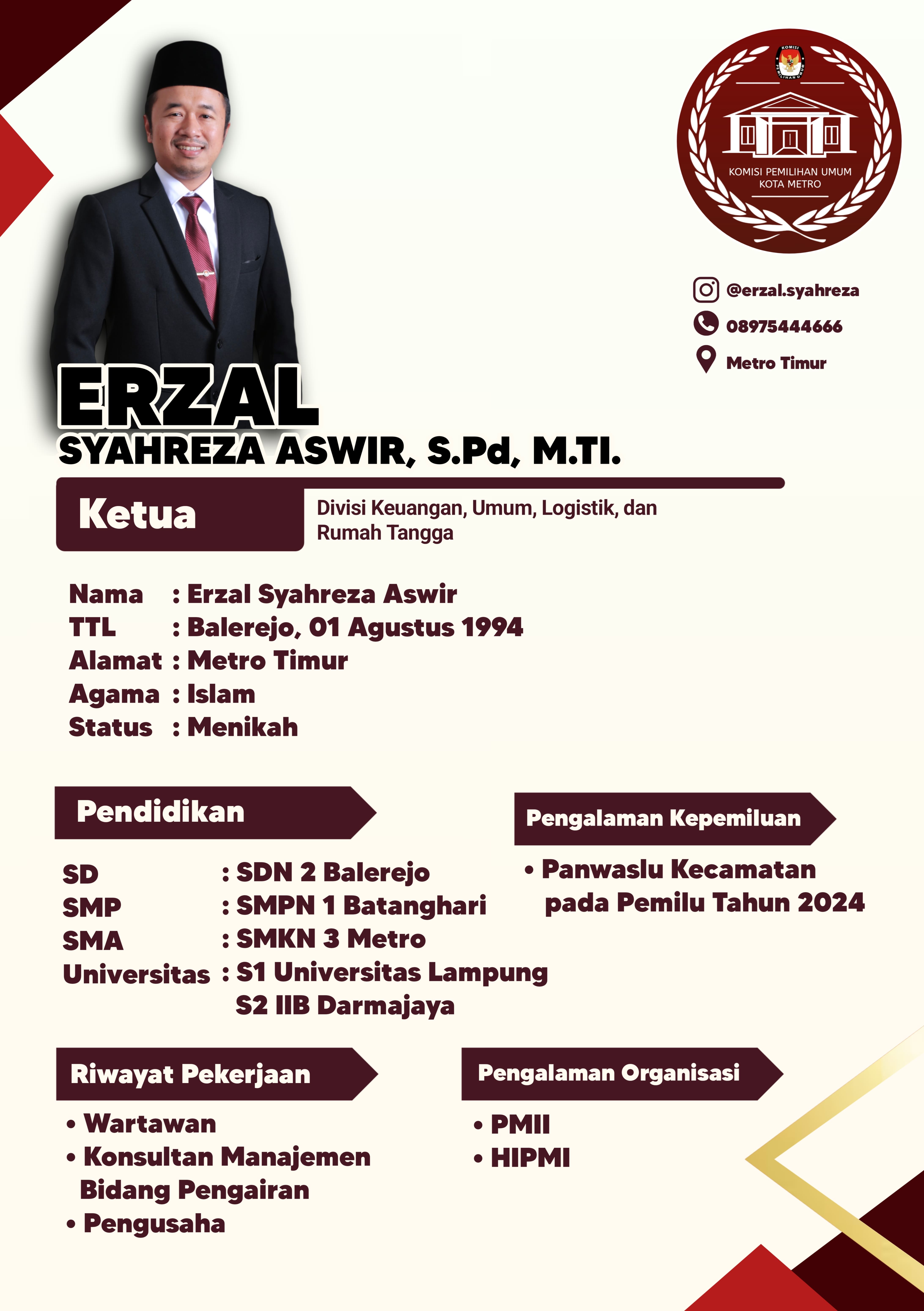 ERZAL SYAHREZA ASWIR, S.Pd.,M.TI. (Ketua KPU Kota Metro)